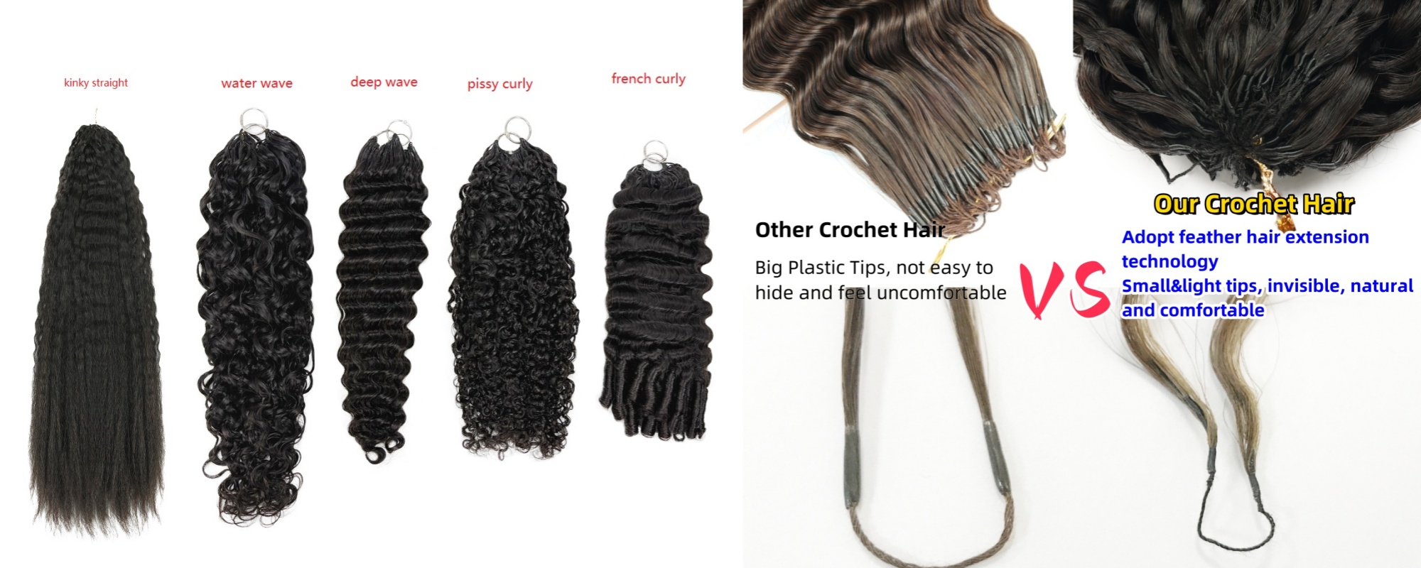 We have a well-established and mature supply chain for crochet human hair, ensuring stable quality, fast delivery, and reliable production capacity. We offer a wide range of ready stock in various textures and colors, allowing customers to quickly meet market demand. Compared to other crochet human hair, our crochet human hair features smaller tips, making it more invisible, lightweight, and natural-looking.