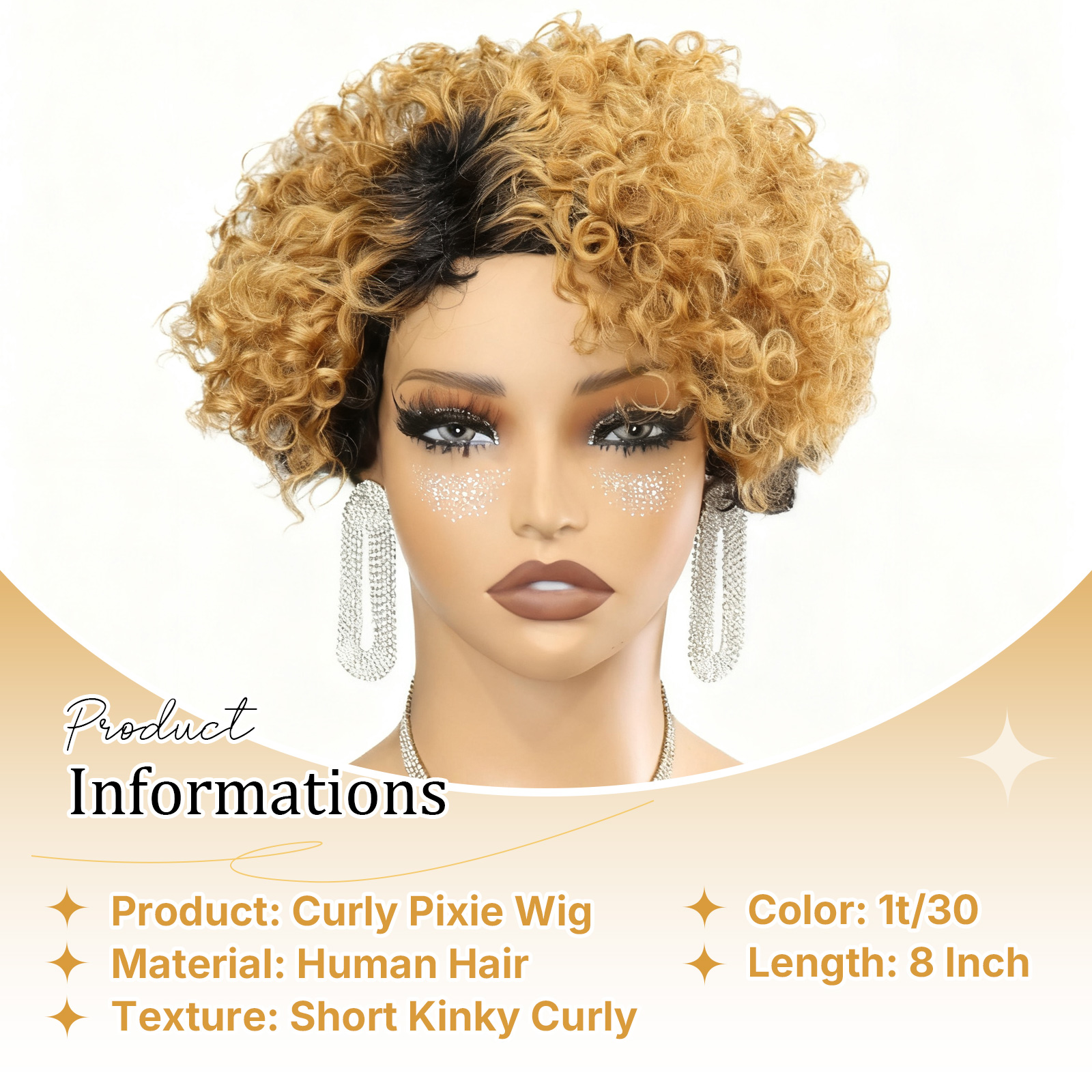 FH #1BT30 Short Pixie Wig Human Hair Kinky Curly Glueless Wigs for Women No Lace